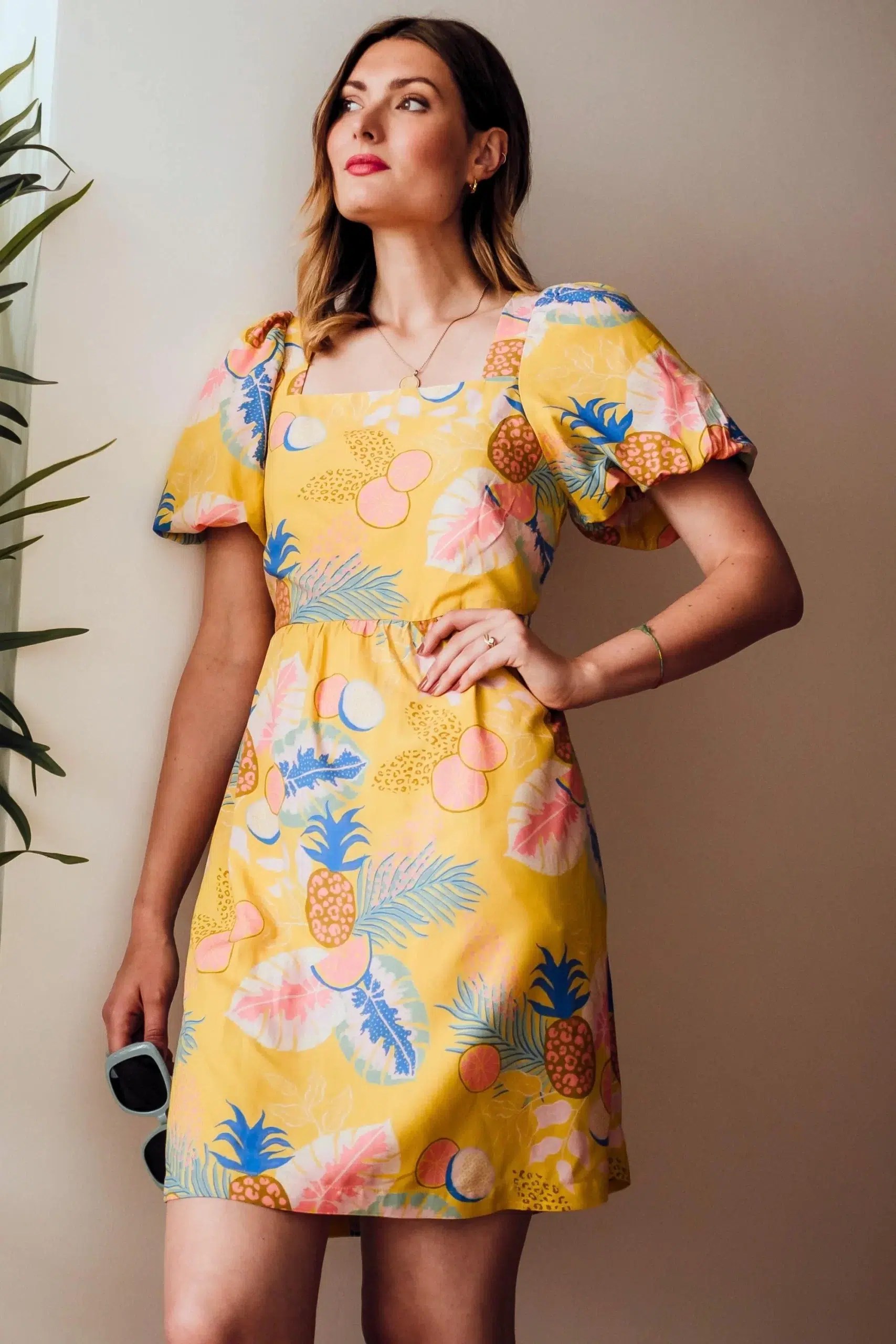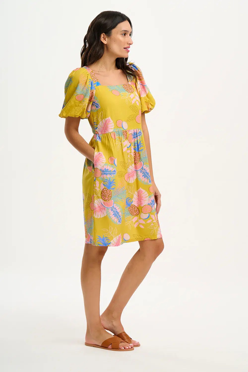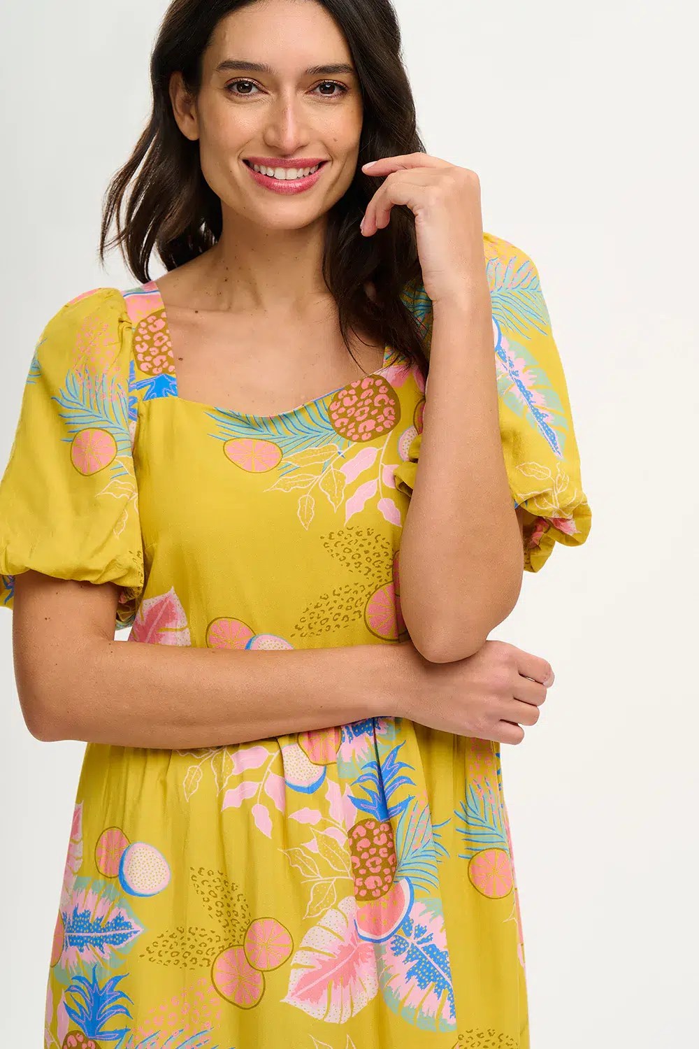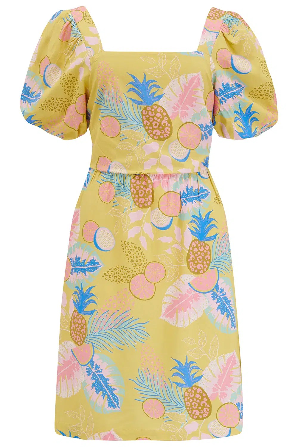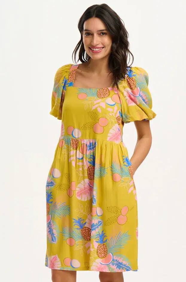 Μίνι φόρεμα με τετράγωνη λαιμόκοψη, πλαϊνές τσέπες και κοντά μανίκια.