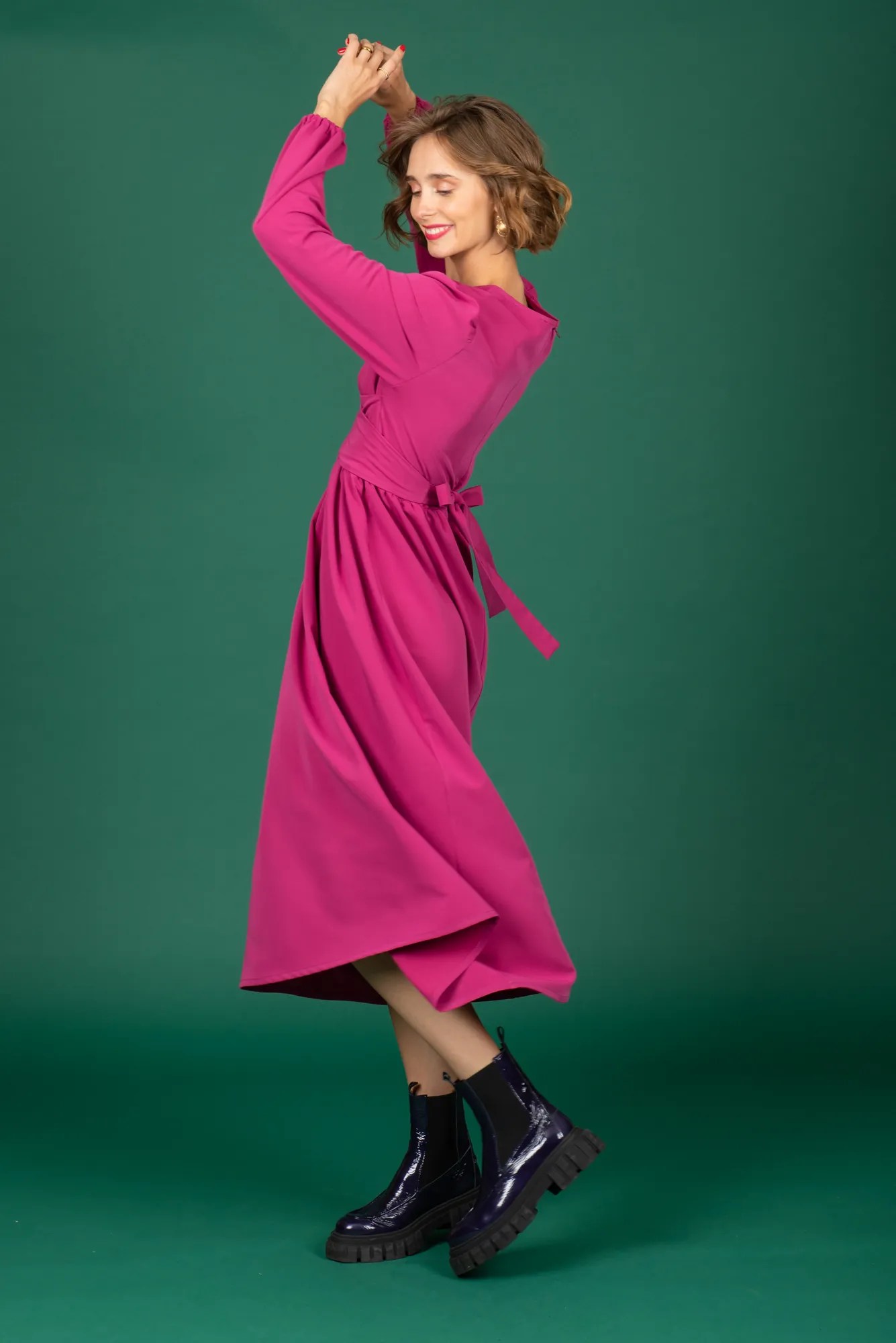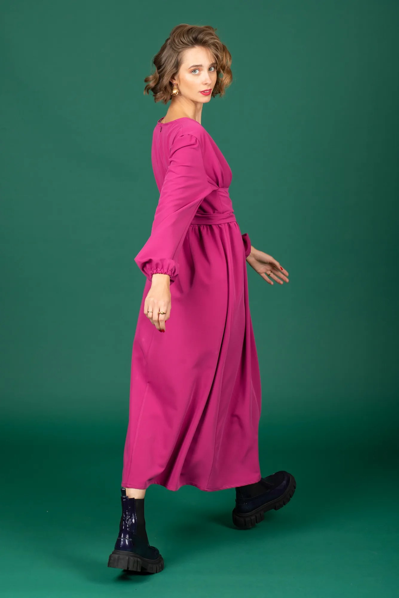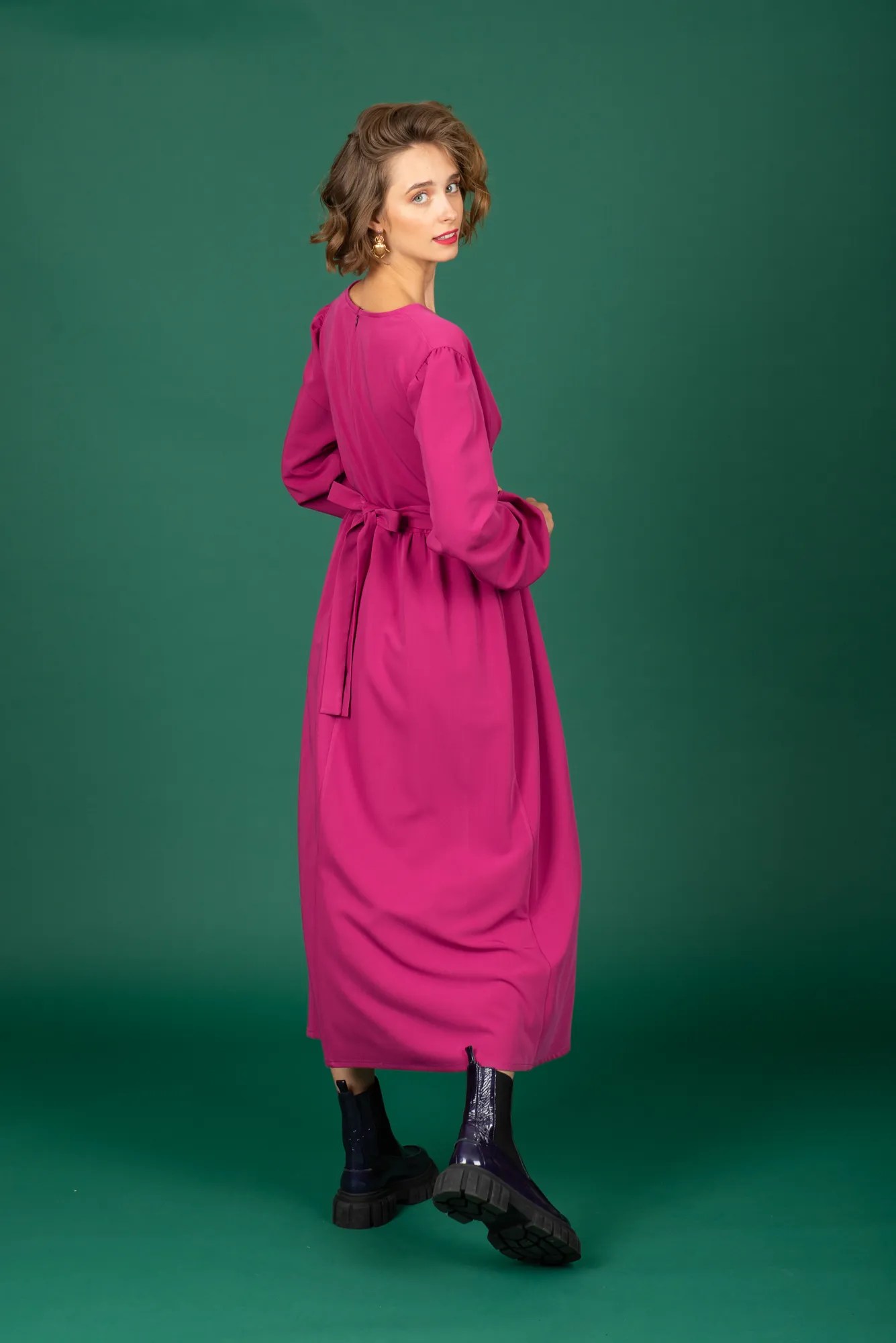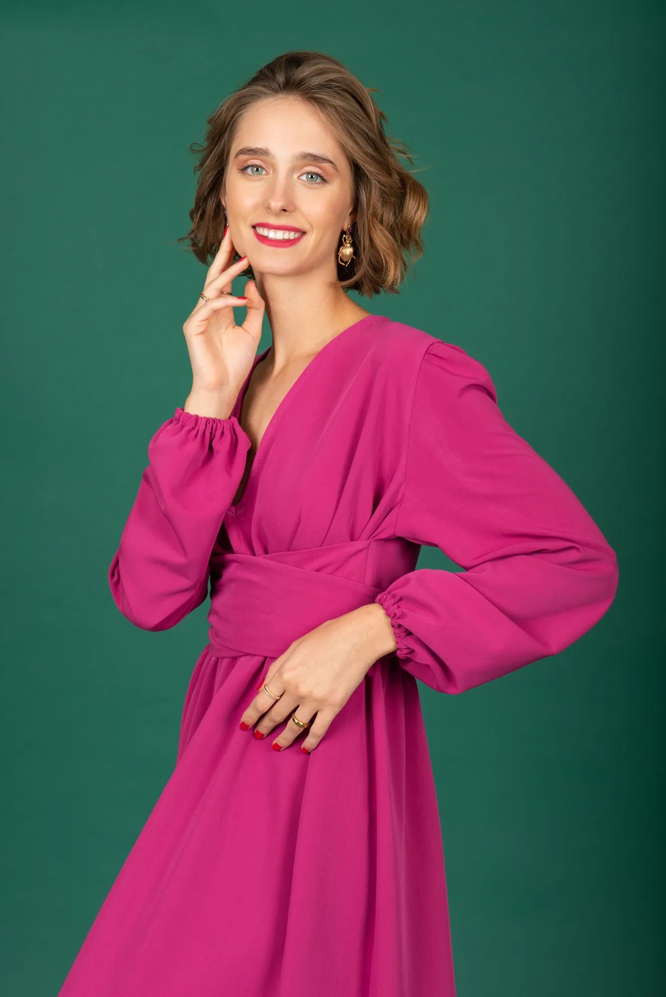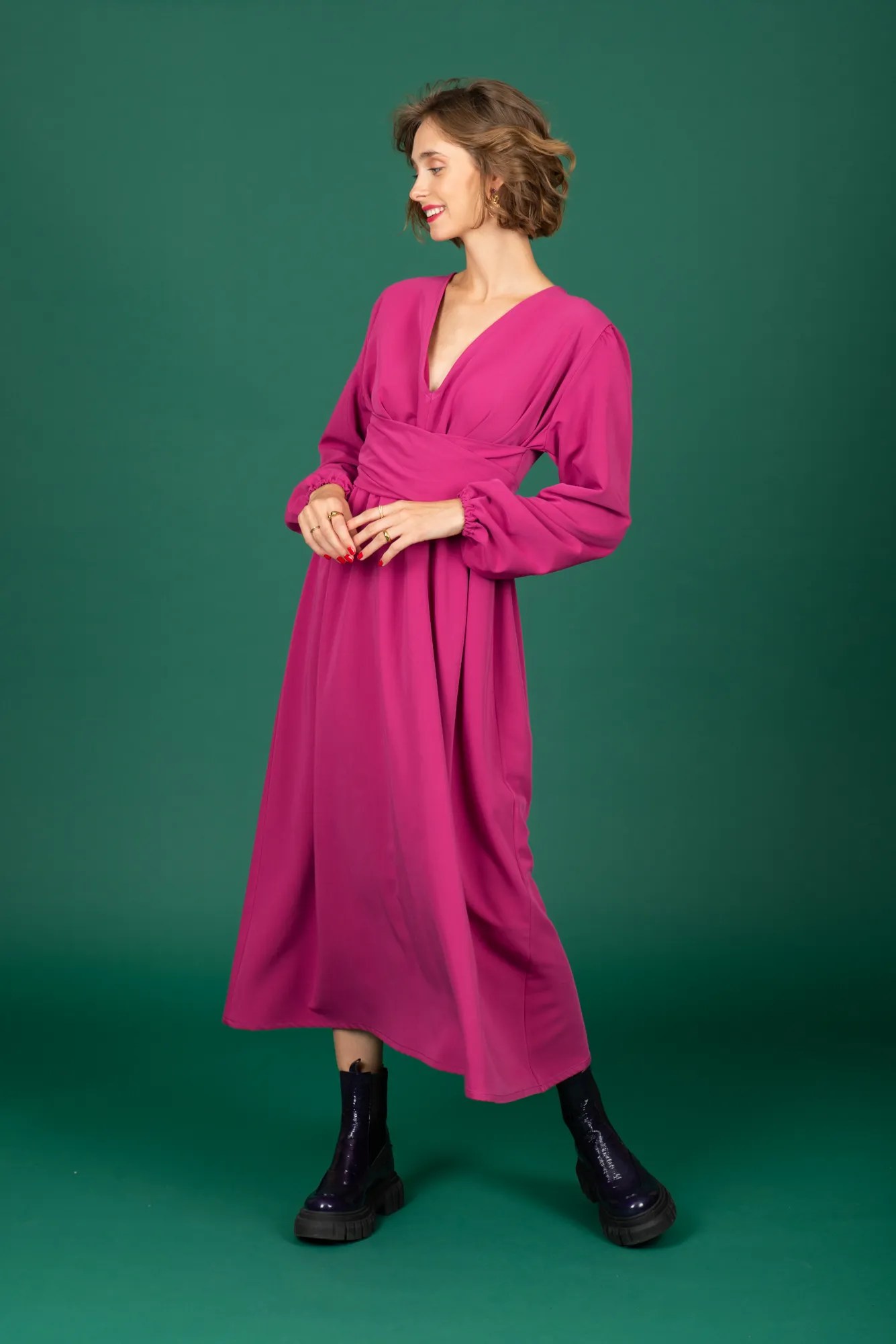 Midi φόρεμα φούξια με βαθύ V λαιμόκοψη και υφασμάτινη ζώνη.