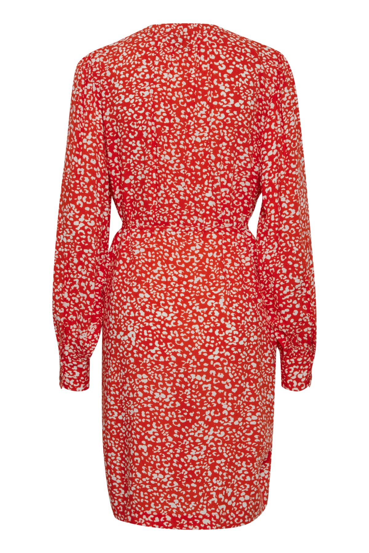 Κόκκινο μακρυμάνικο φόρεμα με μήκος πάνω από το γόνατο, στρογγυλή λαιμόκοψη και ζωνάκι.