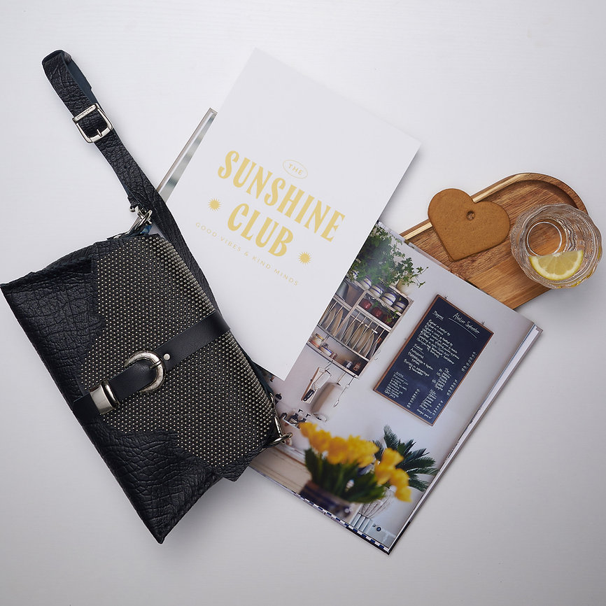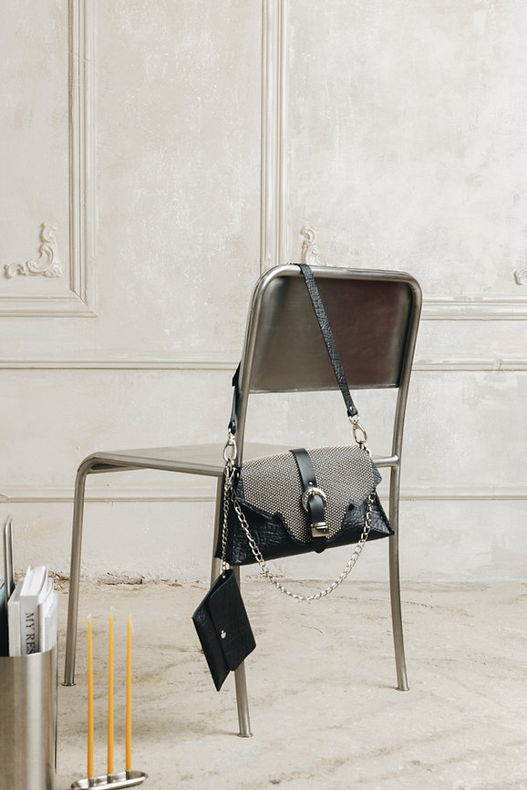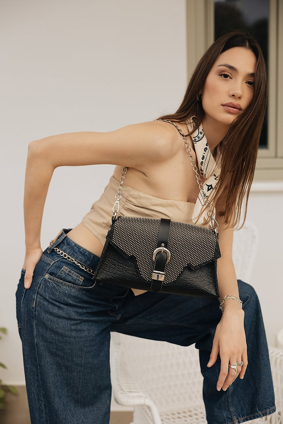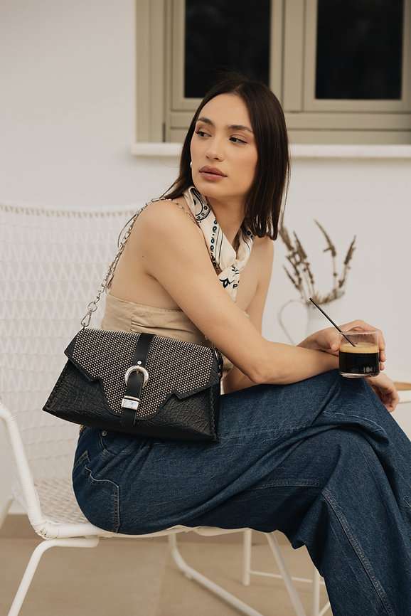 Χειροποίητη δερμάτινη τσάντα ώμου με νίκελ μεταλλικά σκαλιστά στοιχεία. Αποτελείται από δύο λουριά, ένα δερμάτινο με αυξομείωση και μία αλυσίδα. Κλείνει με φερμουάρ και περιλαμβάνει αποσπώμενο δερμάτινο πορτοφολάκι στο εσωτερικό της.