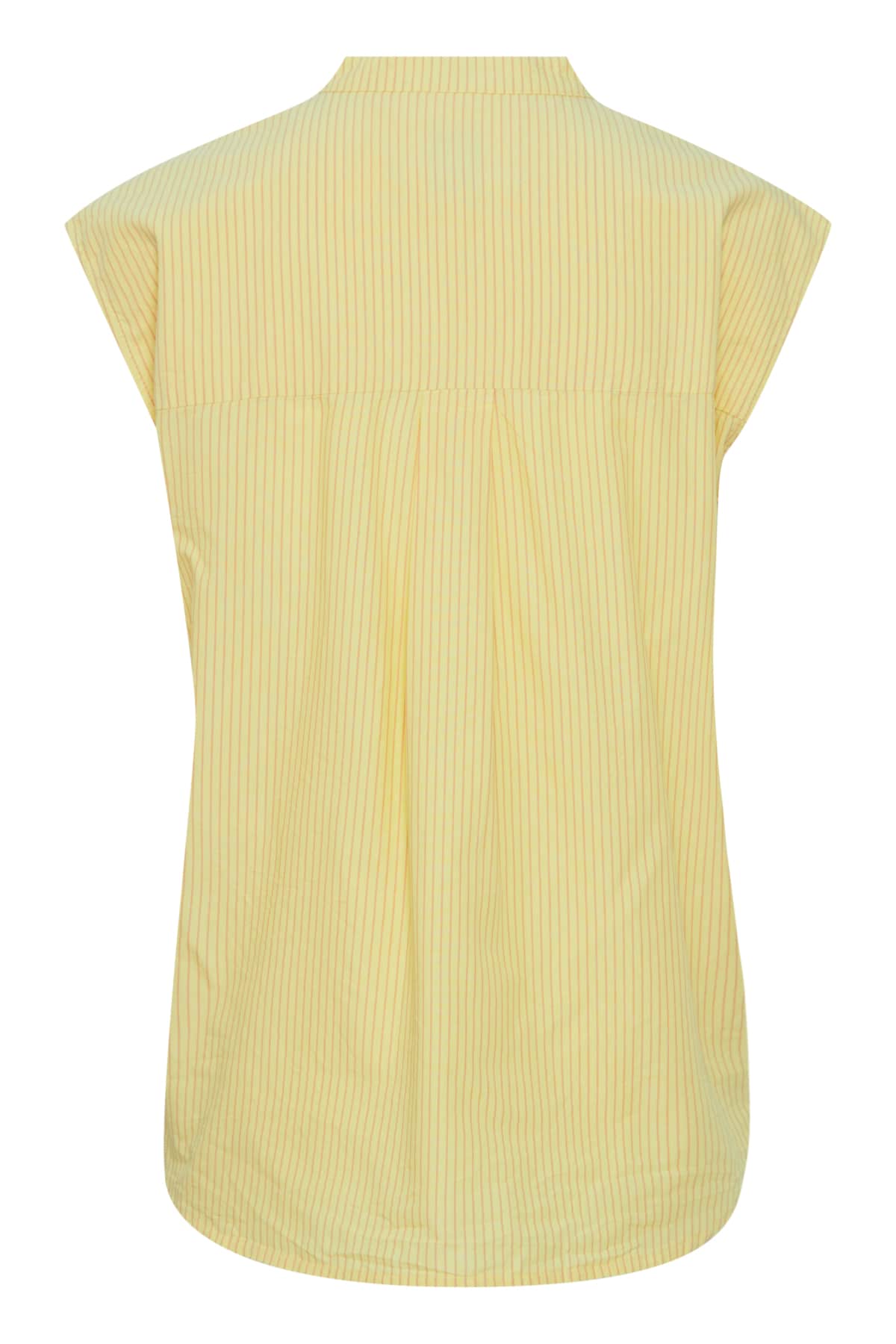 Αμάνικο κίτρινο ριγέ πουκάμισο με V γιακά και κουμπάκια.