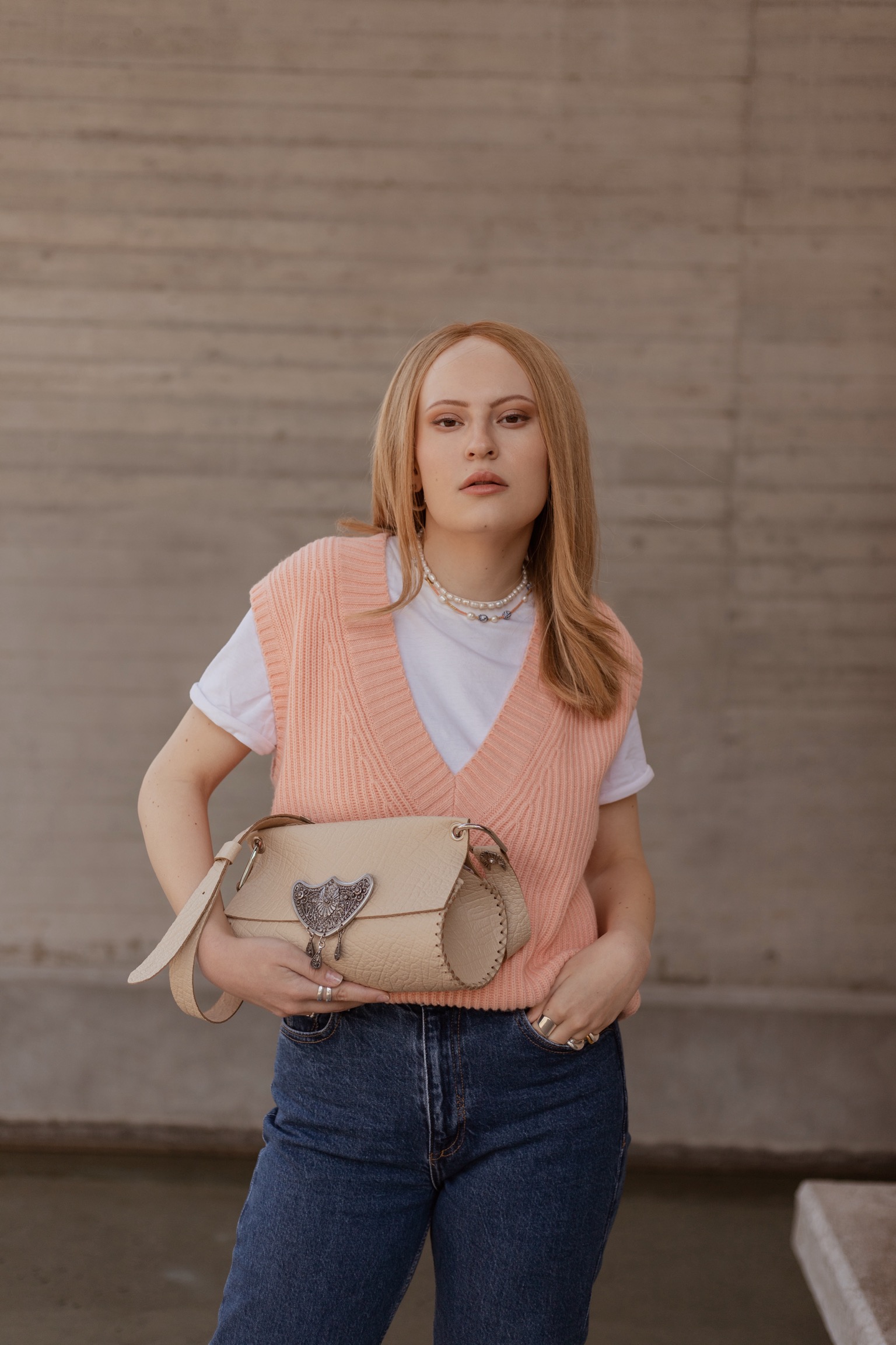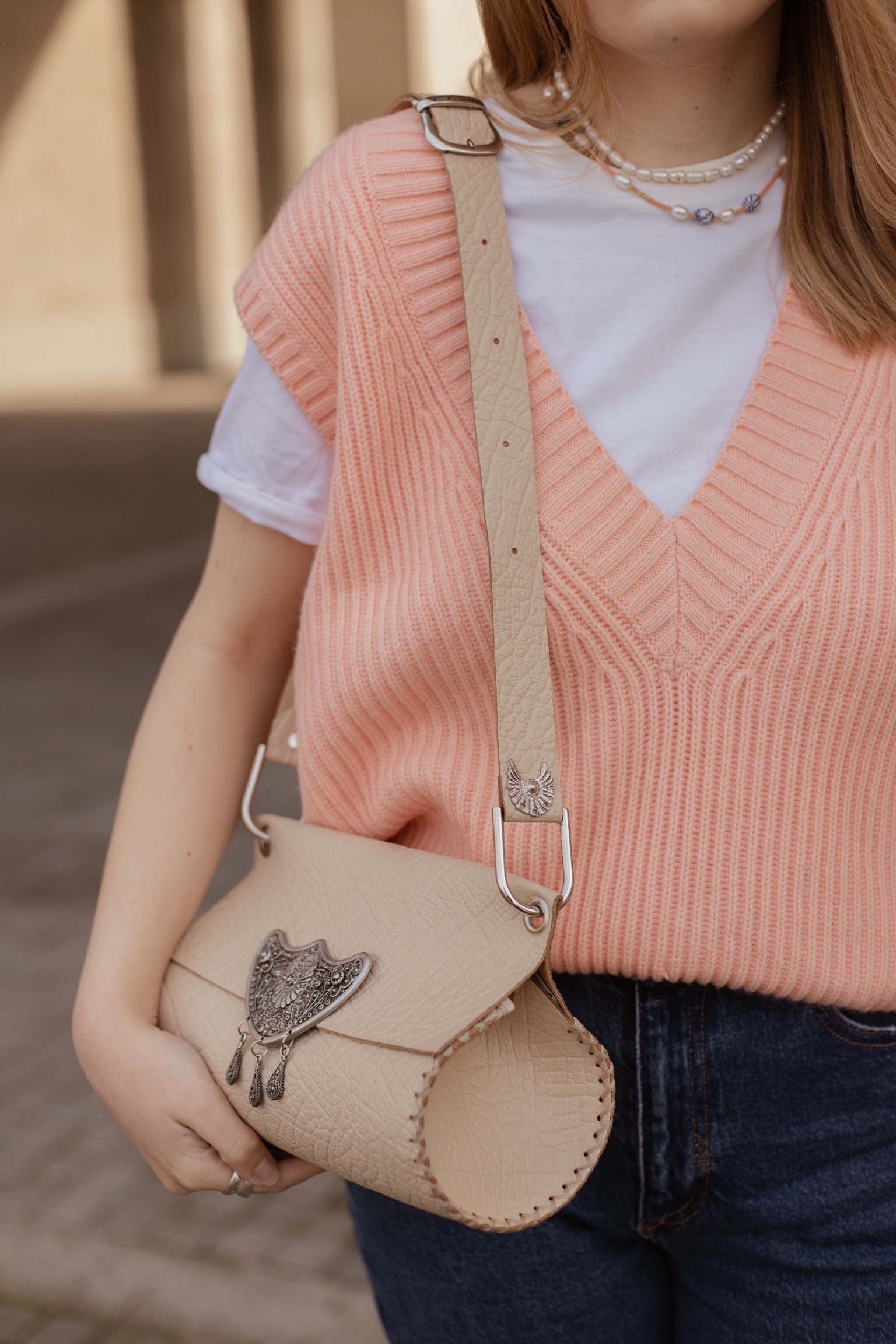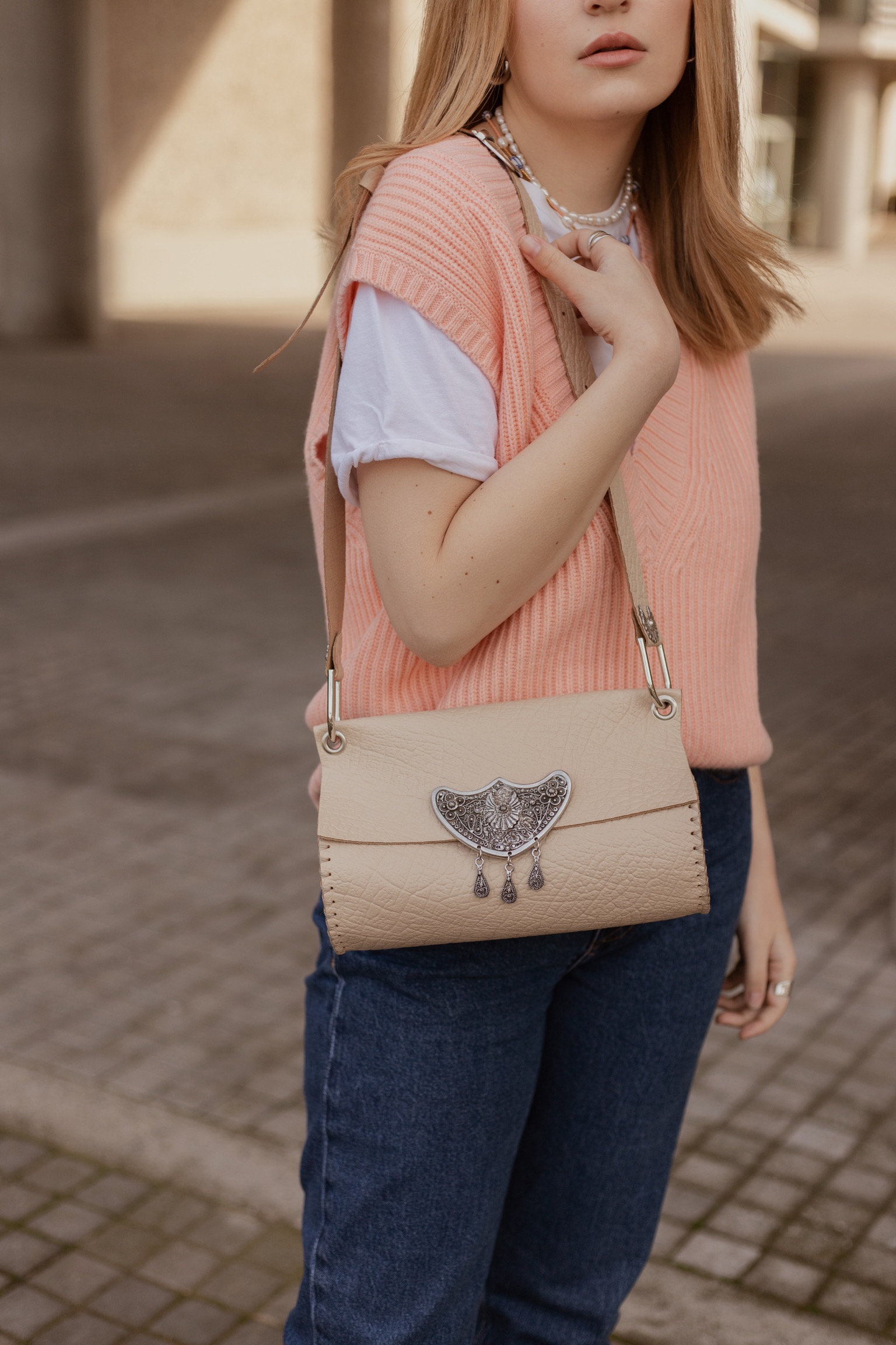 Χειροποίητη δερμάτινη τσάντα ώμου με νίκελ μεταλλικές λεπτομέρειες, μαγνητικό κούμπωμα και δερμάτινο λουρί με δυνατότητα αυξομείωσης. Περιλαμβάνει αποσπώμενο δερμάτινο πορτοφολάκι.