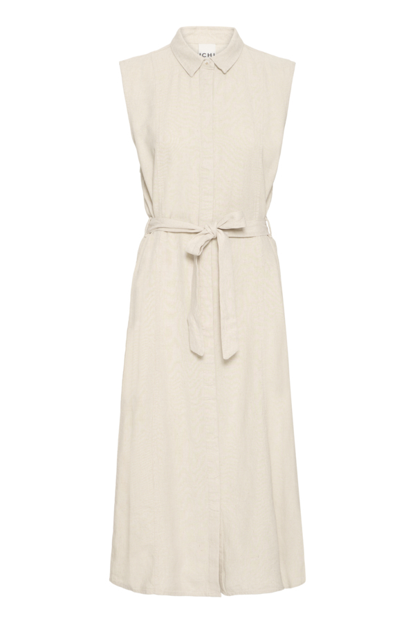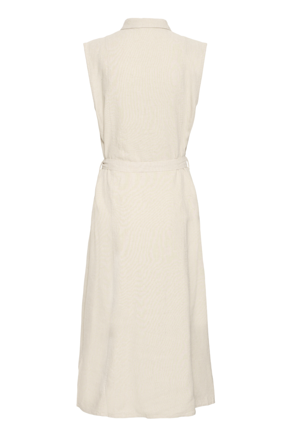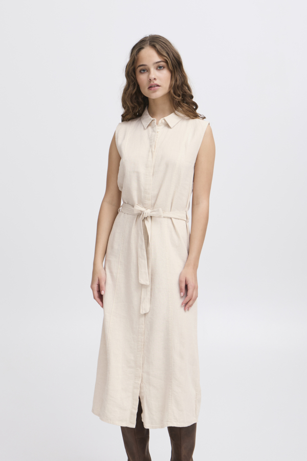 Λινό αμάνικο φόρεμα με κουμπιά και ζώνη.