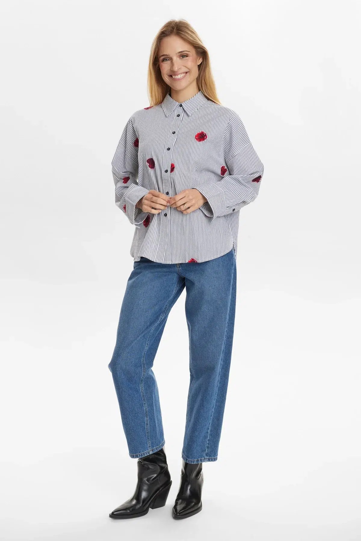 Ριγέ βαμβακερό πουκάμισο με κεντήματα και άνετη γραμμή.